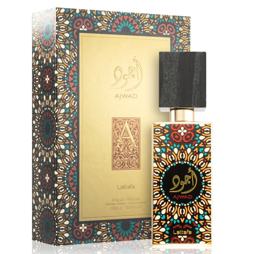 Lattafa Ajwad е аромат, който започва с жизнени плодови нотки, преминава през сърцевина от роза и жасмин и се успокоява в топла основа от мускус, ванилия, кехлибар и кедър. Този аромат е създаден за тези, които ценят ухание, което съчетава радостния изблик на плодови нотки, класическата красота на цветните нотки и успокояващата топлина на мускусни и дървесни нотки, предлагайки обонятелно пътешествие, което е привлекателно, елегантно и дълбоко успокояващо.