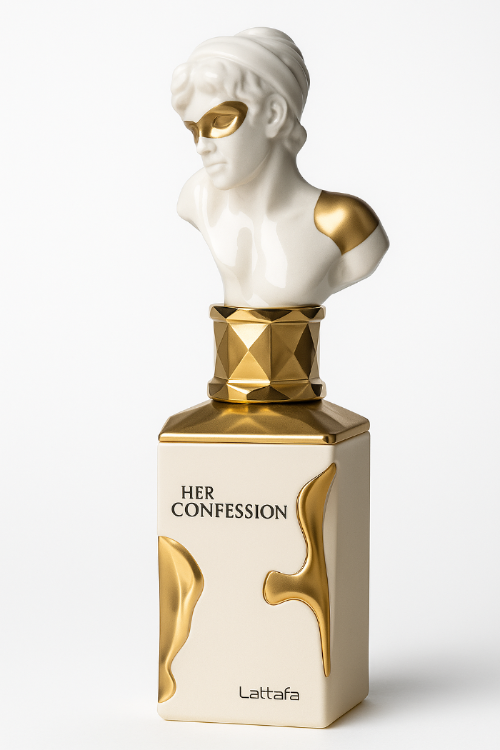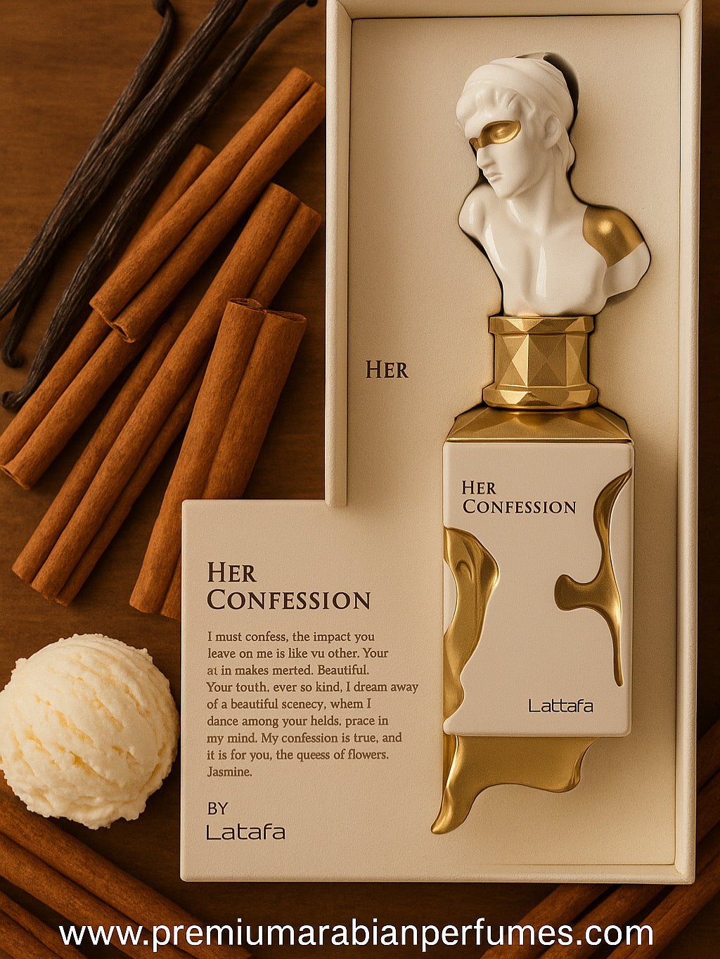 Lattafa Her Confession е завладяващ дамски парфюм, който съчетава топли връхни нотки от канела и мистикал, изискани средни акорди от жасмин, тубероза, тамян и махоний, и чувствени базови тонове от зърна тонка, мускус и ванилия.